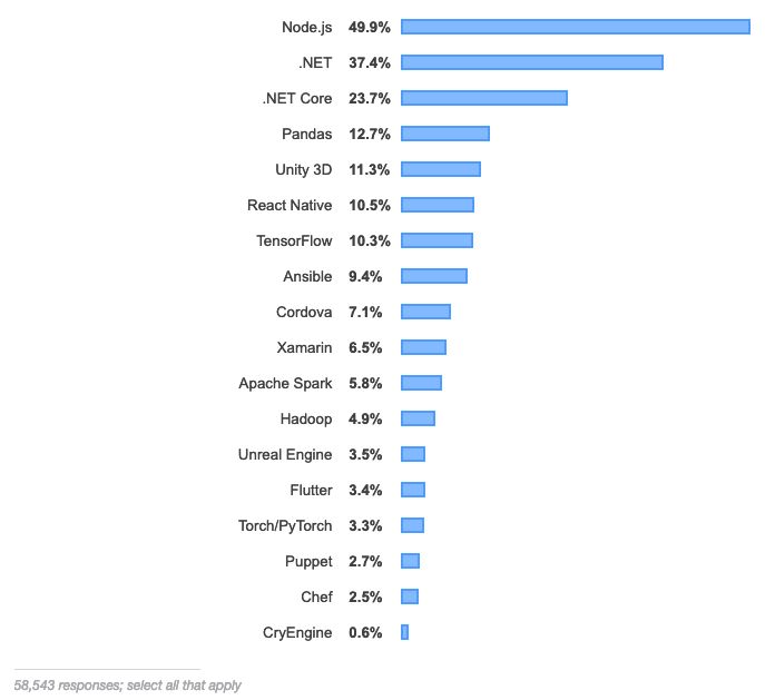 可以看到,Node.js 是最常用的,而越来越多的开发者使用.NET 而不是.NET Core。