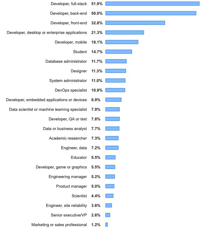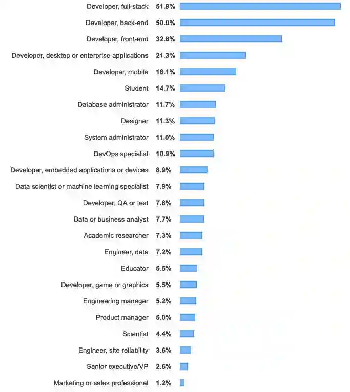 约 50% 的受访者认为自己是全栈开发者,约 17% 的人认为自己是移动开发者。