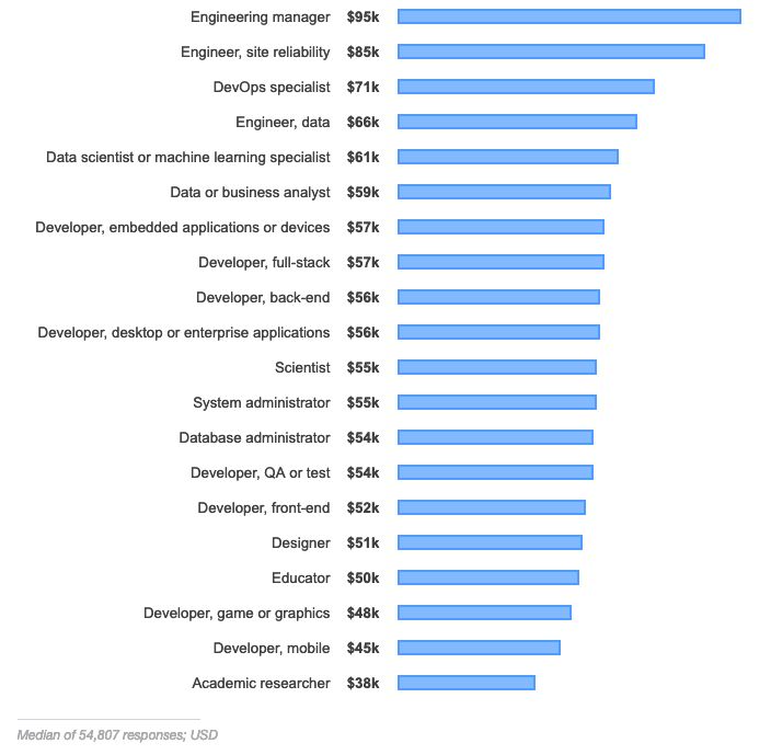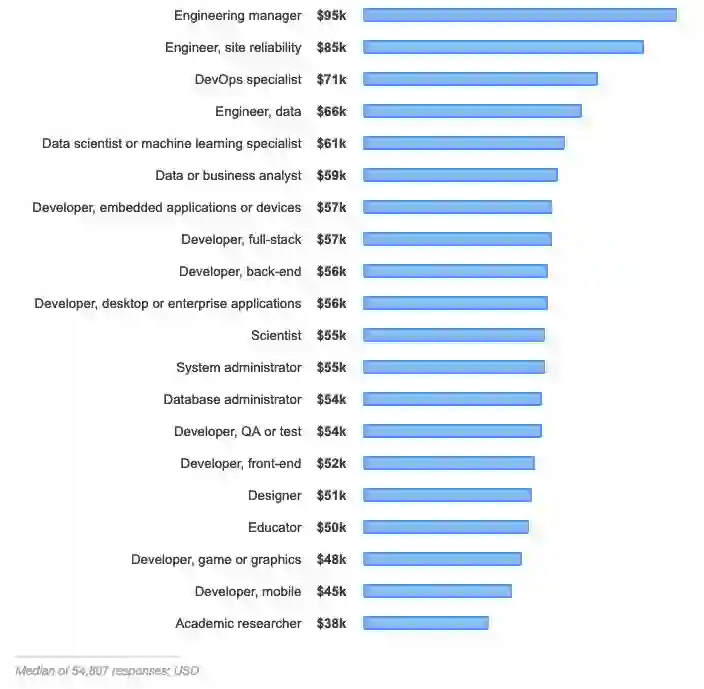 工程经理、SREs、DevOps 专家和数据科学家 / 工程师的薪酬最高。