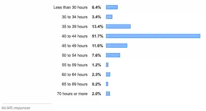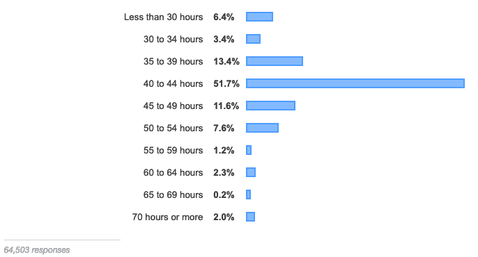 今年,Stack Overflow 第一次询问了受访者每周工作多少小时,四分之三的人说他们每周工作少于 45 小时。高级管理人员、产品经理和工程经理以及东欧、印度和美国的开发者工作时间更长。
