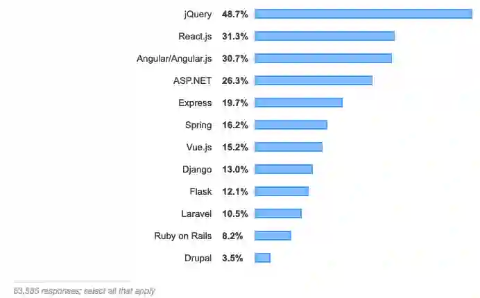 今年的调查将 Web 框架与其他框架和库分开讨论。结果显示,jQuery 依然是众多 web 框架中使用最广泛的。此外,今年使用 React.js 的开发者比使用 Angular 的多,跟去年正好相反。