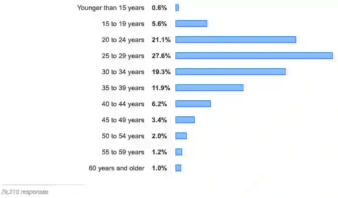 在接受调查的专业开发者中,约有四分之三的人年龄在 35 岁以下。