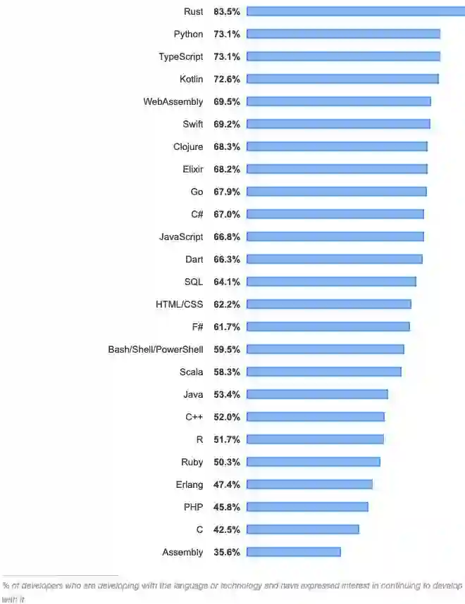 Rust 连续第四年成为最受欢迎的编程语言,紧随其后的是 Python。Python 也是增长最快的主流语言。