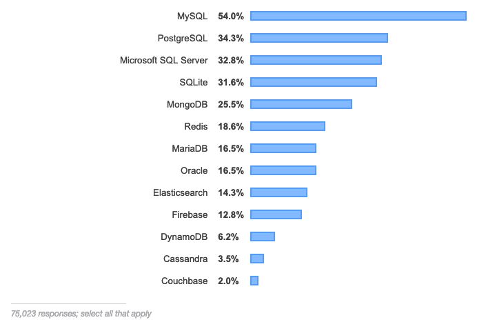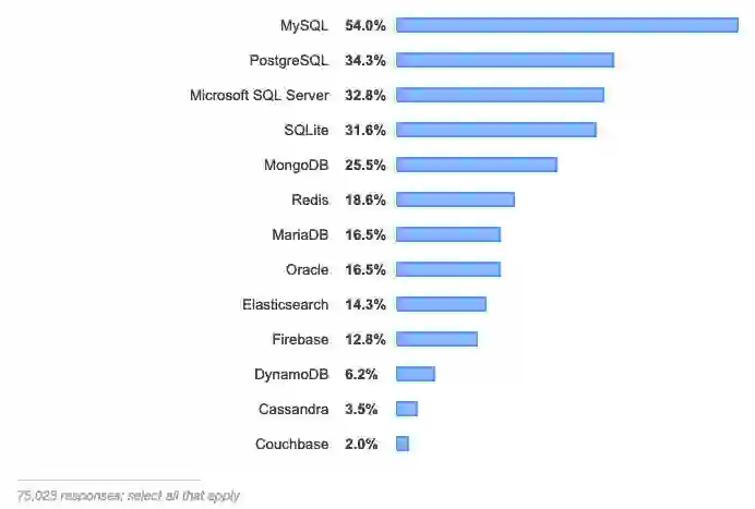 跟去年一样,MySQL 是最常用的数据库,PostgreSQL 次之,略微领先于 Microsoft SQL Server。