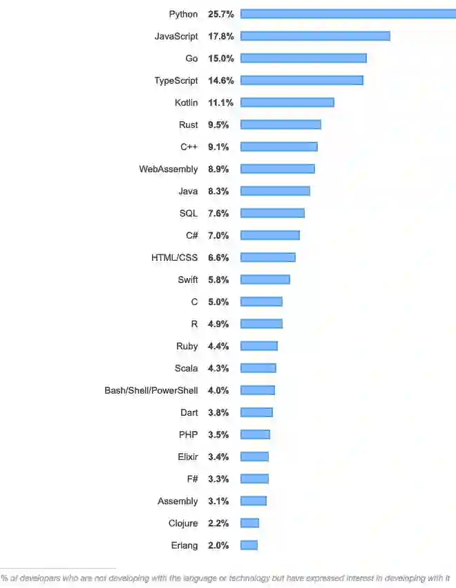 最希望学习的编程语言方面,Python, JavaScript 和 Go 是前三名。尤其 Python,连续 3 年位列最希望学习语言第一名。