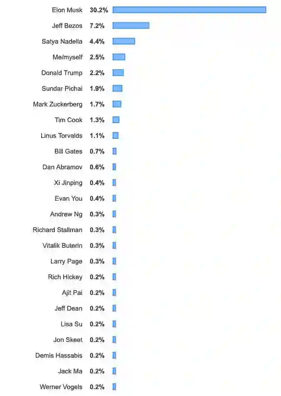 除了特斯拉、亚马逊、微软、谷歌、Facebook 和苹果等公司的首席执行官外,受访者还提到了构建和维护 React.js 和 Vue.js (今年最受欢迎的 web 框架) 的开发者,以及来自 Linux 社区和其他技术领域的领导者。