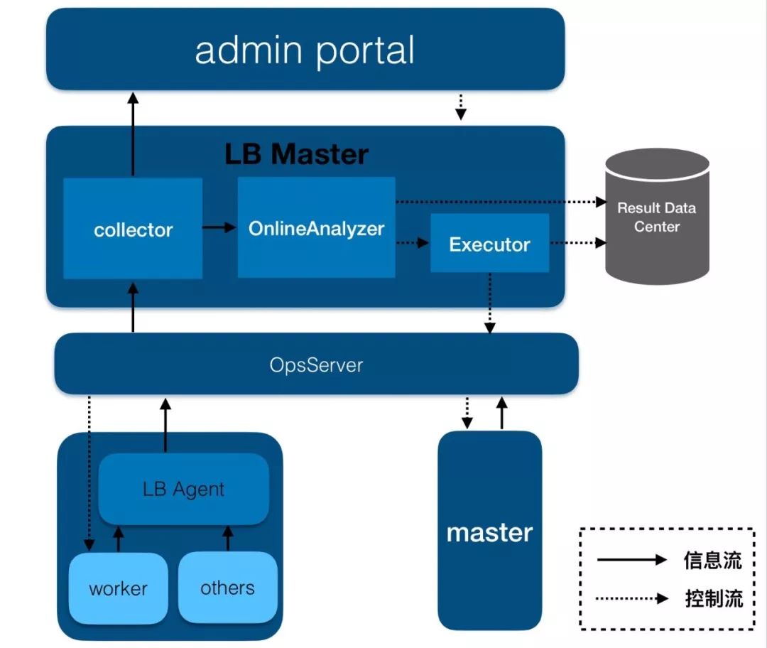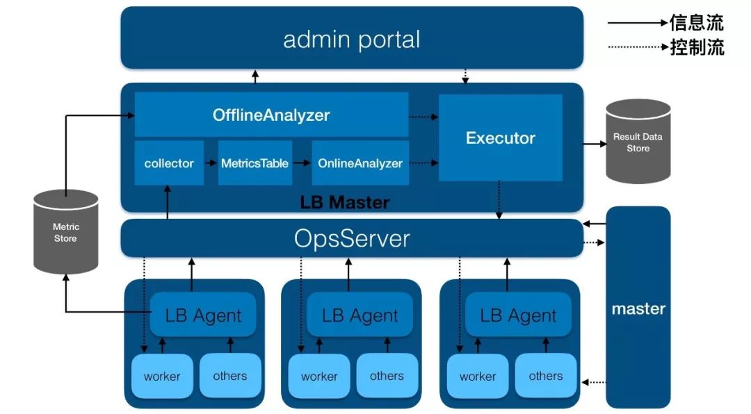 同时,LBMaster还有一个离线分析模块(OfflineAnalyzer),这个模块主要从外部存储系统MetricStore中读取信息,并对这些信息进行分析,以检测系统中是否有潜在问题,如果有,则对这些问题产生相对应的action,同样通过OpsServer交给worker或者master来执行,最终解决潜在的问题,做到防患于未然。
