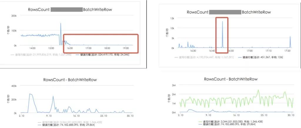 如下图所示,负载均衡系统上线后,写操作的错误率明显降低,并且在发现热点的时候,即错误率突然升高时,能立刻处理掉: