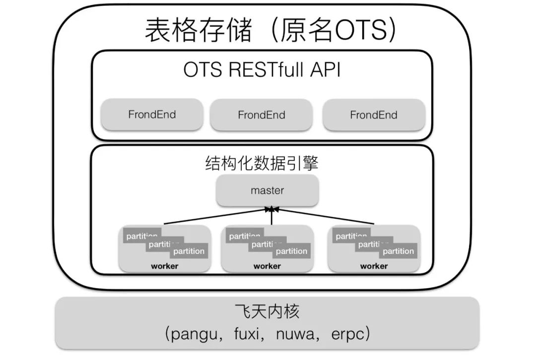 从下往上看,表格存储是基于飞天内核的产品,飞天内核主要提供了分布式共享存储、分布式锁服务、通信组件等基础功能。