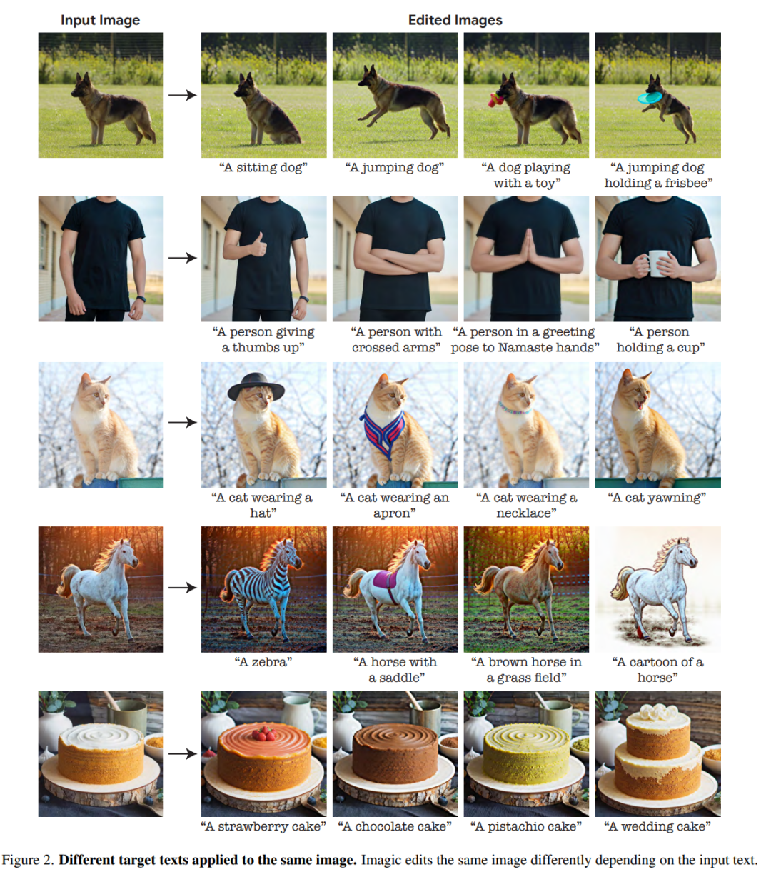 图 2 中是对同一张图片进行了不同的文字 prompt 实验,显示了 Imagic 的多功能性。