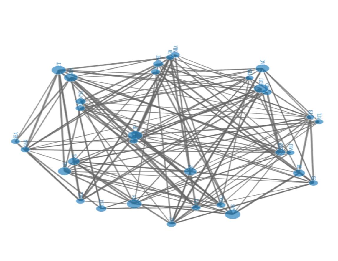 简单来说Sportsnetrank基于pagerank的思想,将球队之间的比赛建模成图,结点是球队,边是球队之间的战绩(得失分)。然后在图上运行pagerank,就可以得到每个球队的实力评估分数,pr值越大,球队实力越强,胜率越高。下图是基于NFL联赛构建出来的图,结点越大,球队越强。边越粗,说明球队交手时差距越大。