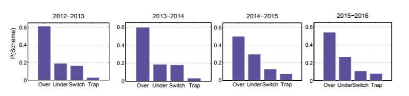 然后作者手动标记了四种类型的若干样本,并进一步训练构建了分类器来发现更多的挡拆。最终识别结果如下:全部270823个挡拆,“挤过”146314个,“绕过”69721个,“换防”37336个,“包夹”17451个。对这些进一步分析可以得到以下一些有趣的结论: