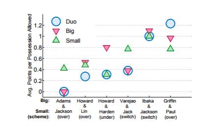 下图比较了不同防守组合面对挡拆的每回合失分以及他们各自与所有球员搭档的平均每回合失分。克里斯-保罗和布雷克-格里芬是使用挤过的效果是最差的之一,平均失去1.2分。另外伊巴卡和雷吉-杰克逊组合的换防很差,但各自挡拆防守效率很接近。【题外话,如今这两对组合已经都被拆散了,是不是经理看到了这个研究?】
