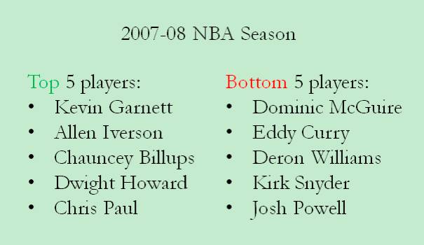 上图是NBA 07-08赛季头部和尾部Top5的球员,看起来非常靠谱,和大部分球迷的认知还是比较一致的。