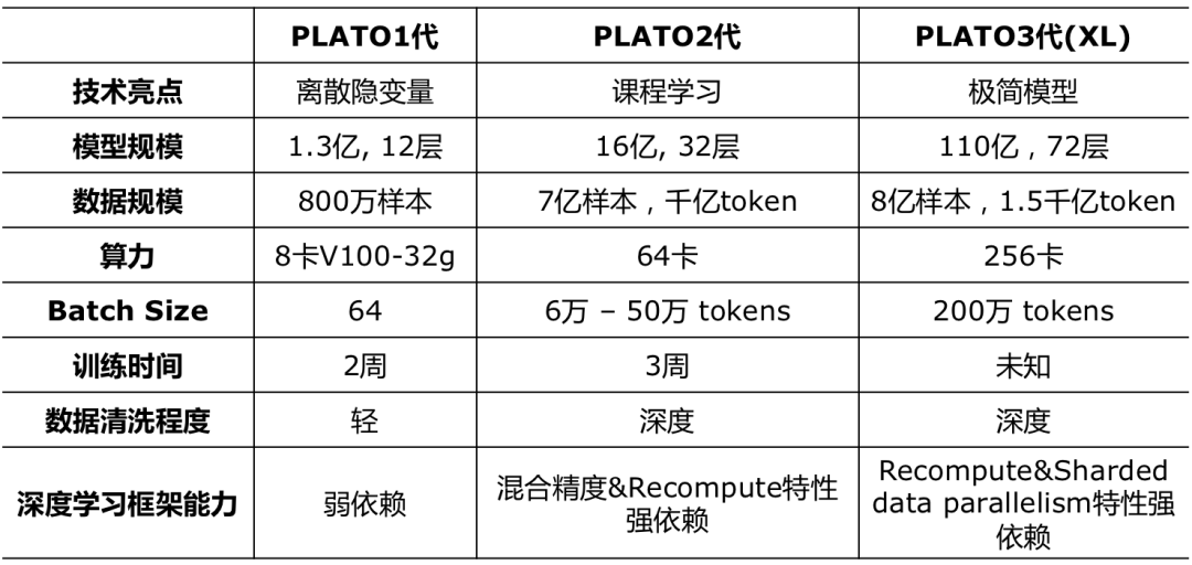 但是朴实无华真的意味着技术简单么,显然不是!只是发生了单点技术贡献的转换。PLATO-3代的参数量在对话领域规模惊人,达到了110亿。这是一个有着72层Transformer,32个注意力头,词向量维度和前向隐层维度都相对大,在256块 V100-32G GPU上训练的单体大模型。PLATO-2代表明,如果单卡要把所有参数装进去,最多可以装入16亿参数。所以除了gradient checkpointing/Recompute[4,5],最新的3代也充分加入了PaddlePaddle新的功能特性:分片数据并行(sharded data parallelism)[6],通过在多个设备上划分优化器状态、梯度和参数来保持低通信量和高计算效率。PLATO3代的batch size达到了惊人的200万token,可以说是提分杀手锏了。从某种角度来说,特定领域模型大而强效果的背后,背书的是一个公司综合能力和一个团队的综合整合资源能力。