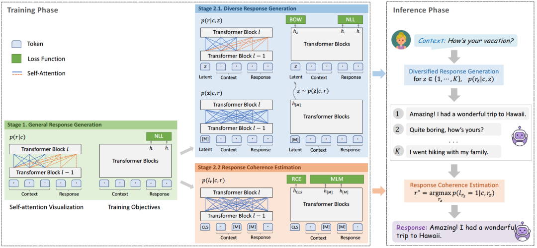 这是一种纯简Transform结构,对话上下文双向编码,回复单向生成,只保留了负对数似然作为文本生成的预训练目标。Token编码+位置编码+类型编码+多轮对话角色编码组成输入也是经典搭配。
