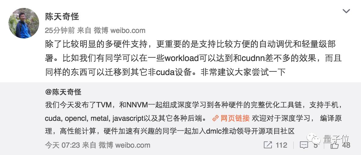 陈天奇在微博上表示,TVM和之前发布的模块化深度学习系统NNVM一起,“组成深度学习到各种硬件的完整优化工具链”。