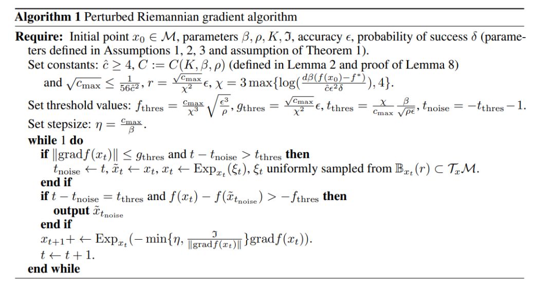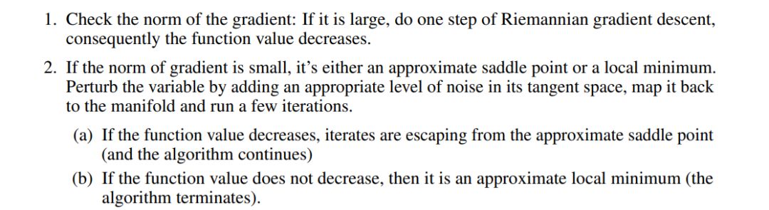 ρ 与参数 ϵ 直接相关,扰动后的黎曼梯度下降(perturbed Riemannian gradient descent)算法将以 1/(2 ϵ^2) 的速率避开鞍点。