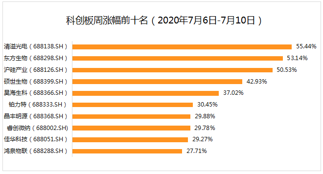 一周涨幅榜上,有精溢光电(688138.SH)、东方生物(688298.SH)、沪硅产业(688126.SH)名列前三,硕世生物(688399.SH)紧随其后。