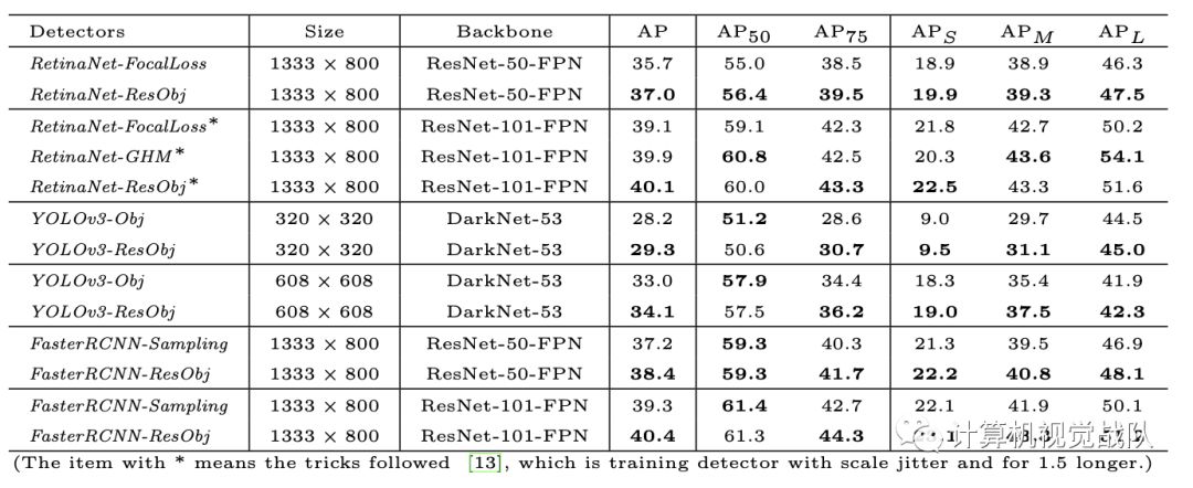 从最终结果来看,该方法迁移到不同方法上均有性能提升,在RetinaNet中有1个点的提升,和GHM相当;在YOLOV3和Faster RCNN中也有1个点的提升。如下:
