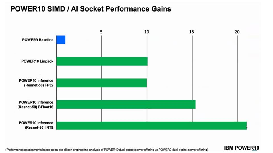 考虑到 AI 越来越重要,IBM 增加了对其他指令和数据类型的支持。处理器通过新的可扩展指令集支持 Power 的 3.1 版本。POWER10 也意味着 IBM 更加重视 CPU 中的 AI 推理性能。