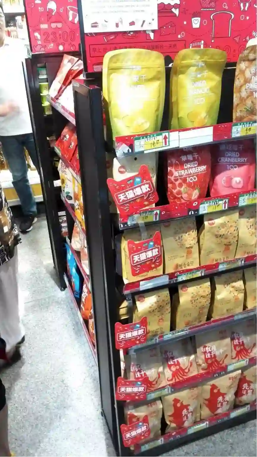 小店里还有个新加的天猫货架,黄店主说这个货架销量还不错,上面的货品是零售通的人给选的,都是以前没有的东西,年轻人买的比较多,能带些人流进来。后面的货架黄店主说都是以前就有的,就把货架距离拉大了一些。