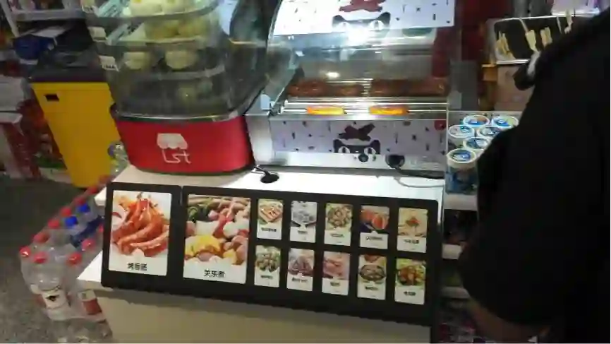 黄店主表示,天猫的改造主要是四部分,门口店招,新天猫零食货架,包子、关东煮等鲜食,还有POS机,据说以后还有其他服务。现在最招人的就是门口的这个天猫电子屏,老黄店主推荐老赵以后也选电子屏店招。
