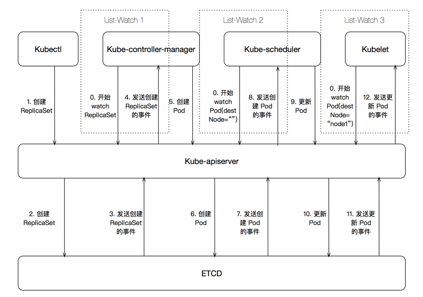 首先 controller-manager, scheduler, kubelet 都会和 apiserver 开始进行