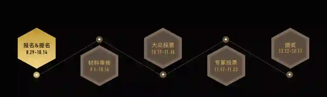 评选分为线上报名&提名、材料审核、公众投票、专家投票评选及现场颁奖五个阶段。
