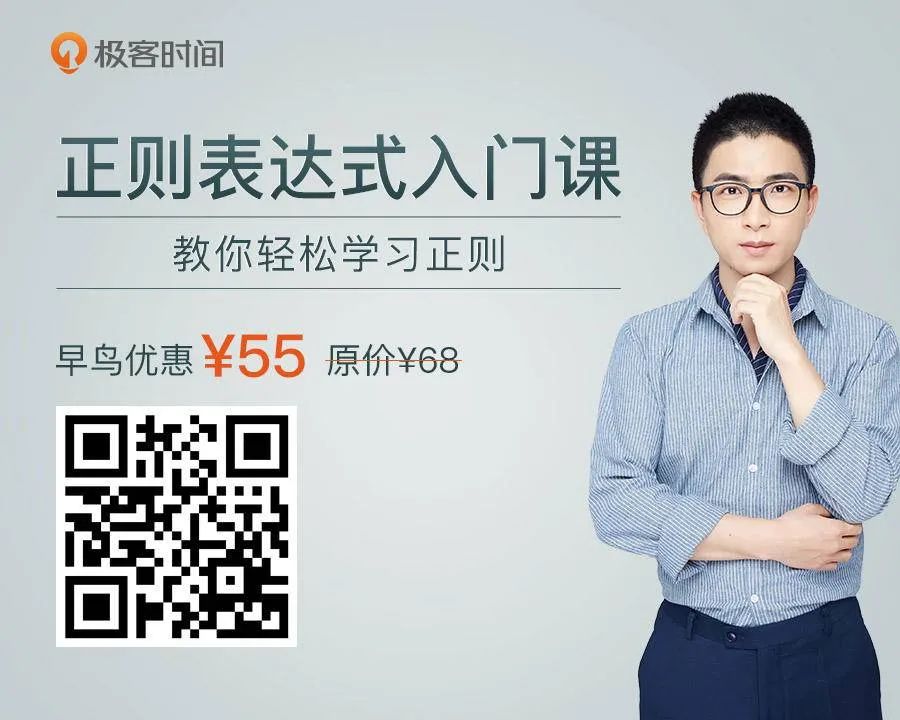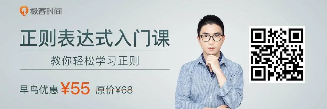 在视频中,关于正则记忆和使用,我提炼过一套学习图谱,得到了不少同学的热烈反响,但时长有限,无法展开细讲。所以,这次我在极客时间推出了《正则表达式入门课》专栏,想用通俗易懂的方式,给你套正则的系统学习路径,通过多场景的案例,带你实操正则应用,真正做到可以跨平台、多语言活学活用,让正则这个强大的工具在你手上发挥出真正的威力。