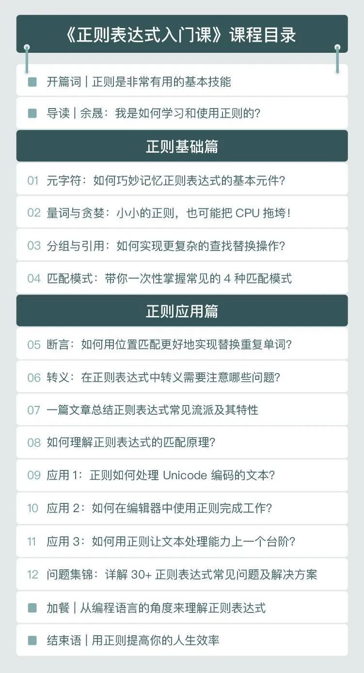 为了真正解决大家「系统学习正则」这一核心的需求,我在设计课程时,会先带你掌握正则重要的概念和功能,再以工作中的真实案例,带你实操应用。基于整个思路,课程共两个模块: