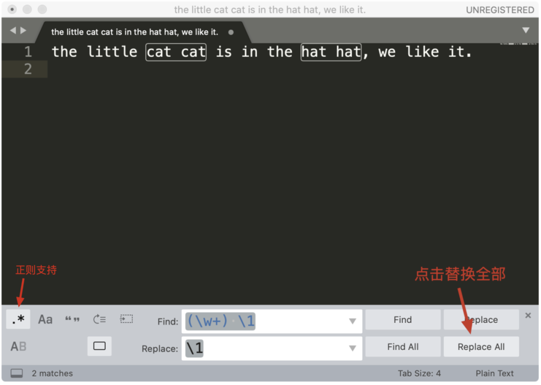 菜单中的 Find -> Replace,在查找栏中输入 (\w+) \1,在替换栏中输入子组的引用 \1 ,然后点击 Replace All 就可以完成替换工作了。这样,通过少量的正则,我们就完成了文本的处理工作了。是不是很方便呢?