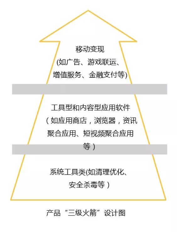 第二级火箭乃是以“桥头堡”为基础,拓展包括应用商店、浏览器、资讯聚合应用等在内的核心工具+内容的应用矩阵,目前正处于探索和迭代该层级产品的过程中。第三级计划是在此基础上,为用户提供更好的产品服务,如游戏、电商、金融科技和金融支付等,打造出完整的移动生态链,并实现商业变现。