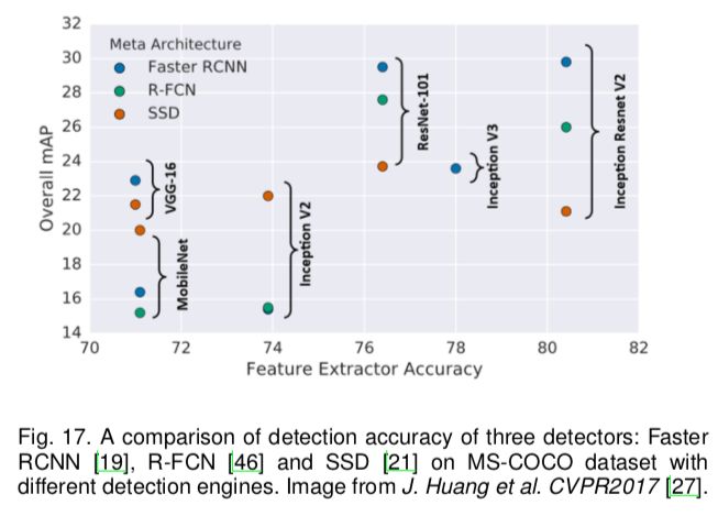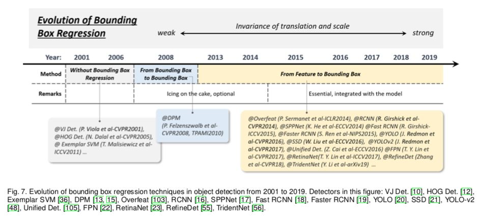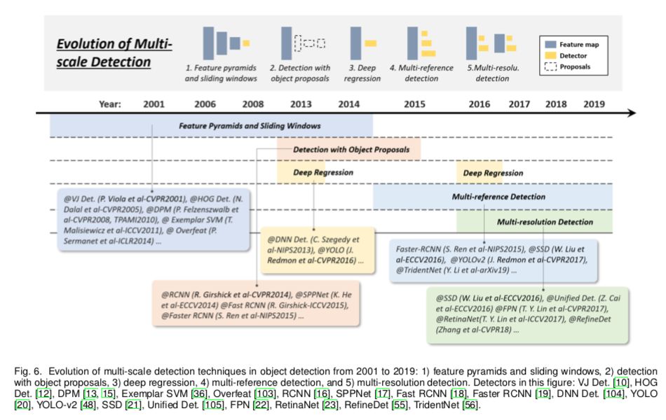 同时作者把目标检测的一些精度提高的方法的出现也列在了时间轴上,比如bounding box regression、multi-resolution detection等。