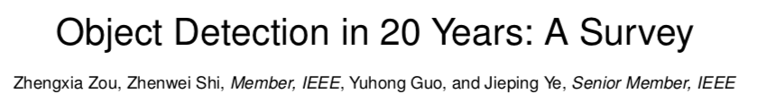 几天前,arXiv新出一篇目标检测文献《Object Detection in 20 Years: A Survey》对该领域20年来出现的技术进行了综述,这是一篇投向PAMI的论文,作者们review了400+篇论文,总结了目标检测发展的里程碑算法和state-of-the-art,并且难能可贵的对算法流程各个技术模块的演进也进行了说明,还深入到目标检测的特定领域如人脸检测、行人检测等进行了总结,最后列举了未来可能的发展方向。