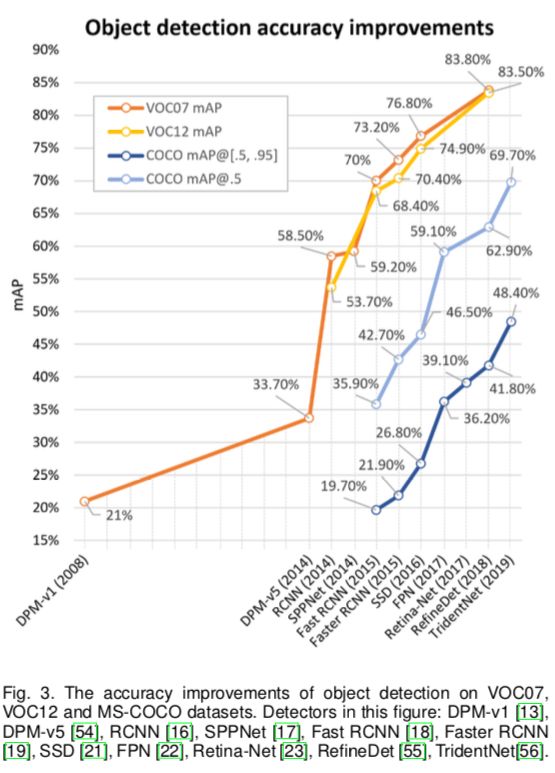 在目前最知名的评估数据集VOC 2007 、VOC 2012、 COCO上不同年份出现的算法精度提高,如下图:
