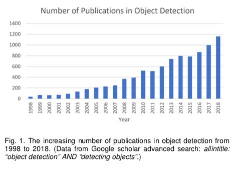 下图是作者在谷歌学术检索目标检测相关关键字返回的历年文献数量,可见该领域20年来越来越受到学术界的关注。2018年有将近1200篇相关文献发表。