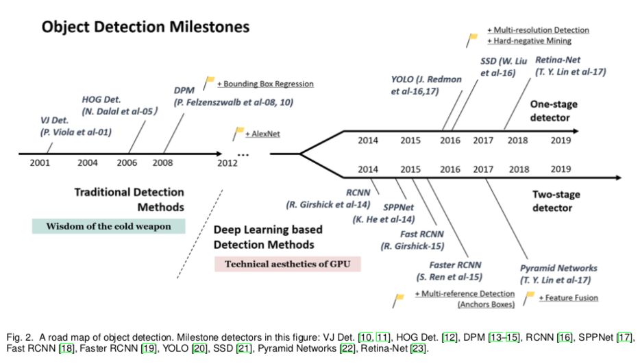 作者将目标检测近20年来的里程碑算法画在时间轴上,如下: