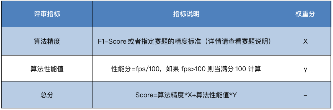 初赛评审规则:2大赛题最终得分采取准确率、算法性能绝对值综合得分的形式,2者的权重比例X和Y请查阅大赛指定赛题对应的【赛道说明】。