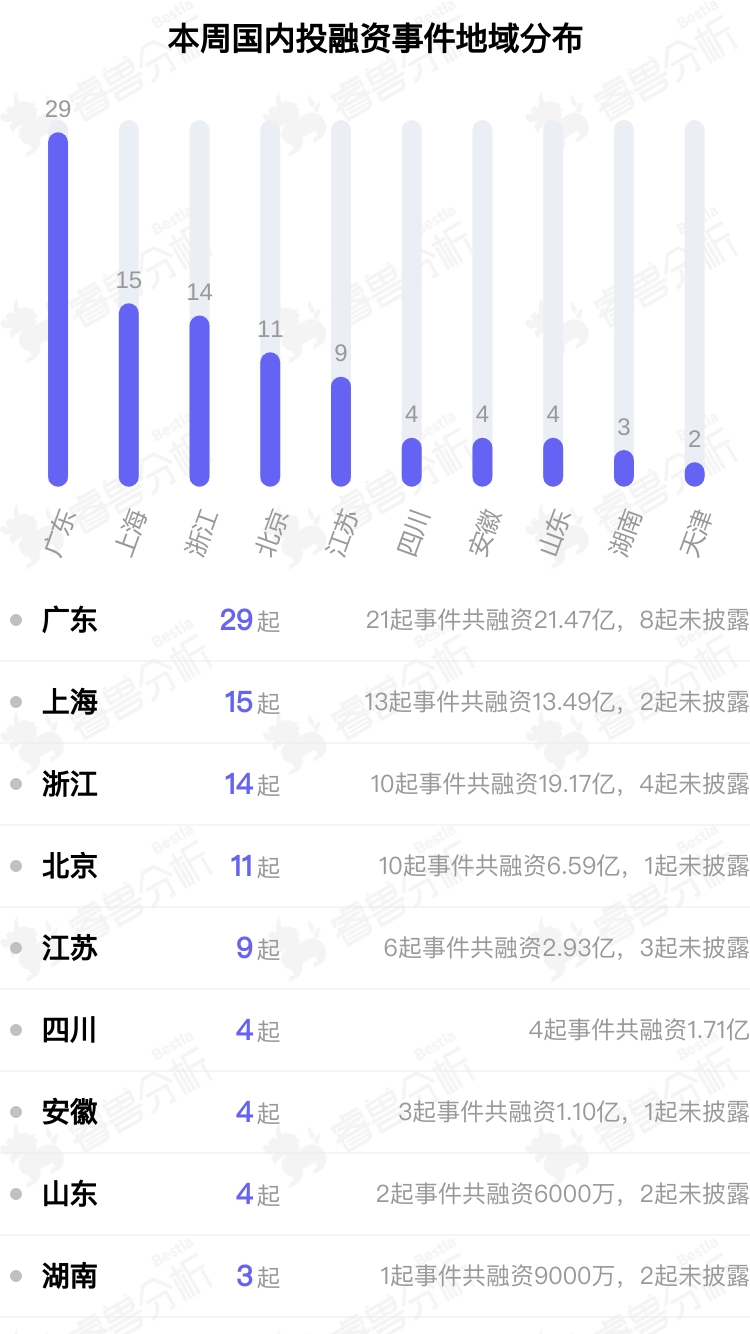 从本周披露获投企业的地域分布来看,主要集中在广东、江苏、北京。其中广东披露29个,上海披露15个,浙江披露14个。