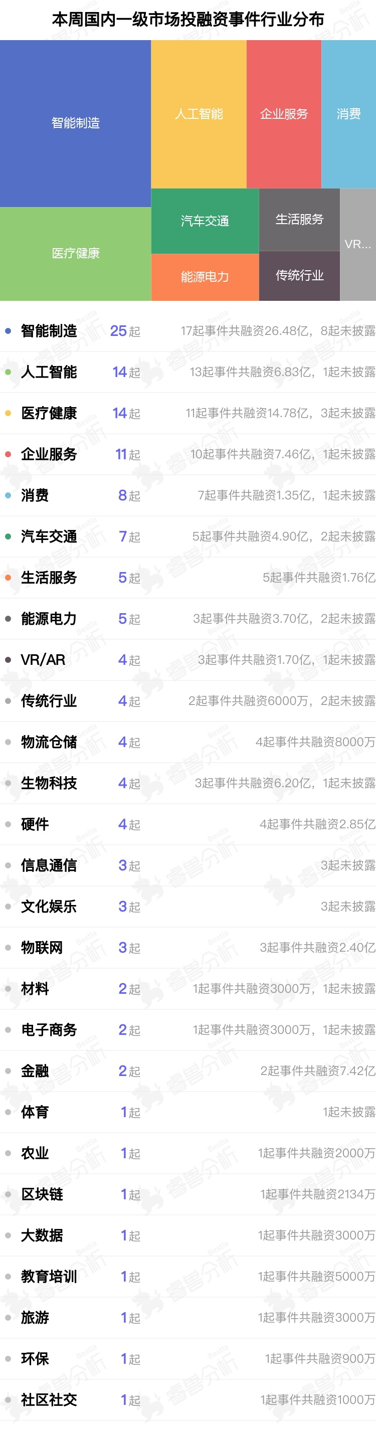 从融资案例数量来看,本周智能制造(25个)、人工智能(14个)、医疗健康(14个)领域融资最活跃。