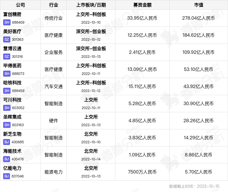 本周重点监测到国内IPO公司共10家。分别于A股主板、创业板、科创板和北交所上市,最新市值最高为「富创精密」278.04亿元人民币。