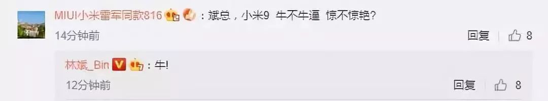 有米粉在小米联合创始人、小米总裁林斌微博下评论:“斌总,小米9牛不牛×、惊不惊艳?”林斌给出肯定回答:“牛”。