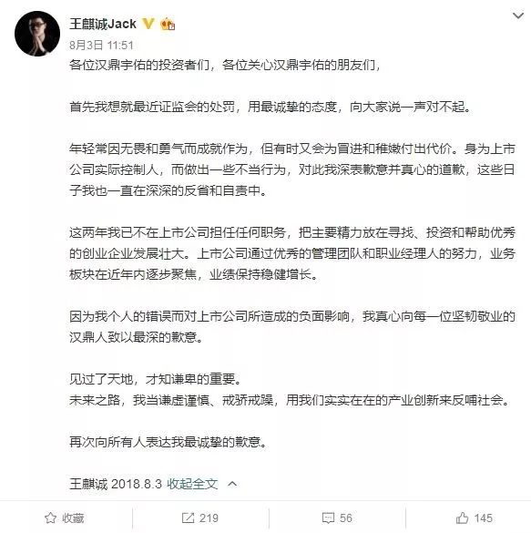 还有一起是曾经的“80后首富”、上市公司汉鼎宇佑实控人之一王麒诚,曾经借着公司筹划重大资产重组时以1500万用他人账户交易自家股票,还亏了48万,被证监会罚款40万。前天王麒诚在微博针对最近证监会的处罚,向投资者表达歉意。值得注意的是,拼多多上市后,“80后首富”已易主黄峥。