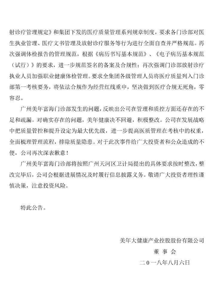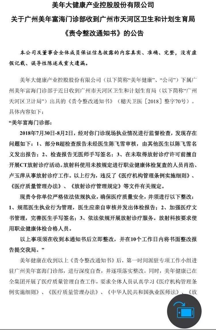 12.美年健康:下属单位收到整改通知书 公司已逐项落实整改