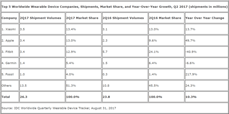 根据 IDC 公布的 2017Q1 季度全球可穿戴市场销量数据,小米以 350 万只销量位居第一,苹果以 340 万只位居第二。两者相似的地方在于产品线都比较精简,没有 Fitbit 那般丰富;但一个是售价低廉的智能手环,一个是相对高昂的智能手表,售价几乎相差了一个数量级,所以苹果销量的「含金量」还是非常高的。