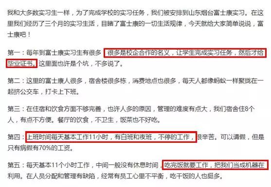 据了解,今年8月25日,一位95后网友“虎诚”在网上发文《富士康实习的生活和工作经验》,其中提到,自己在学校安排下跟同学一起前往烟台富士康代工厂工作。他在文中提到,“上班时间每天基本工作11小时,有白班和夜班,不停的工作,很辛苦。”“中间一般没有休息时间,吃完饭就要工作,把我们当成机器在利用。”