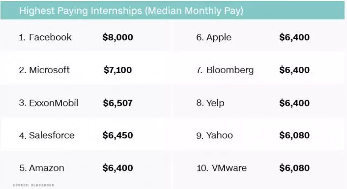 排名第一的是Facebook,实习生的月工资中位数为8000美元,如果按年薪计算相当于9.6万美元,几乎是美国员工工资中位数(51336美元)的近两倍。