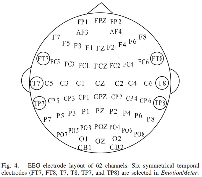 本文工作:本文设计了一种包含 6 个对称颞叶电极的电极放置方式,可以很容易地嵌入到耳机或眼镜框架中。为验证本文算法的有效性,设计了四种情绪(高兴、悲伤、恐惧和中性)的识别实验。