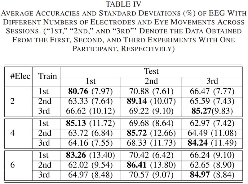 我们选择来自相同被试的不同 session 的总频带 DE 特征和眼动数据特征,构成训练和测试数据集。表 IV 列出了两个,四个和六个电极配置下的平均识别准确率和标准差。这些结果证明了 EmotionMeter 框架的相对稳定性。